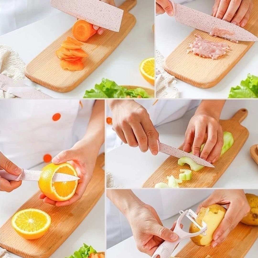 Kit de Facas Inox Coloridas com Tesoura e Descascador – 6 Peças Essenciais para Sua Cozinha