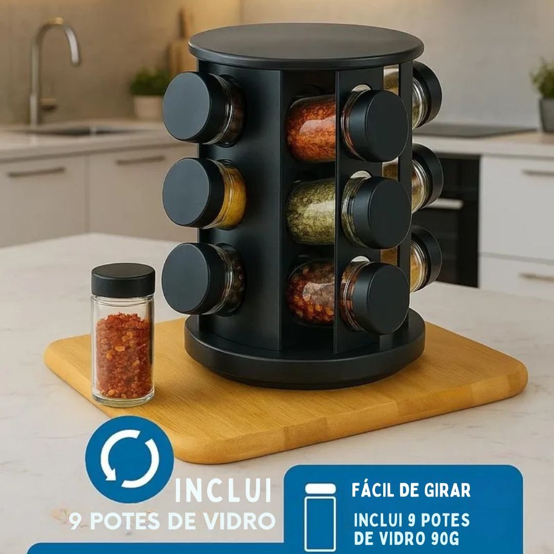 • Porta Condimentos de Vidro com Base Giratória 9 Potes – Dosador Prático