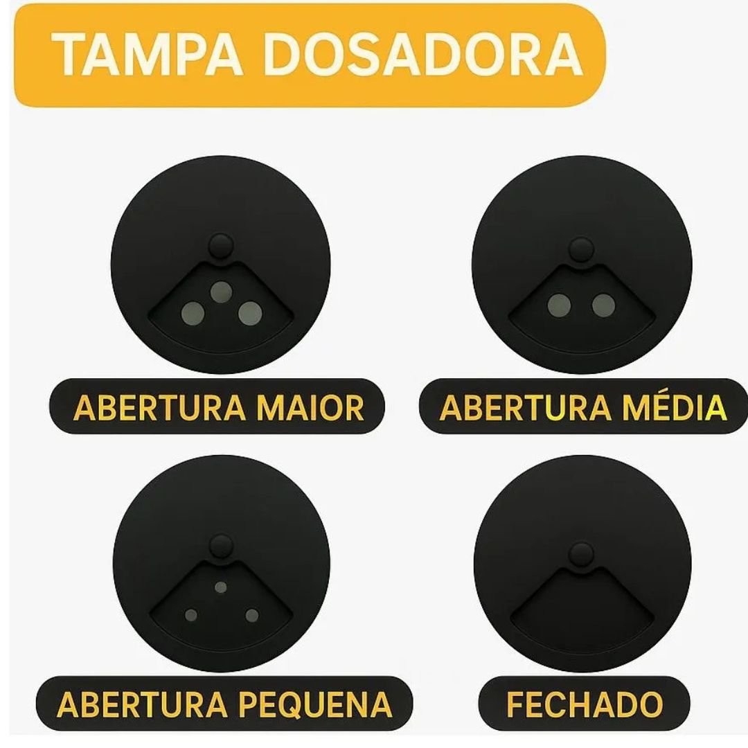 • Potes com 3 modos de saída, facilitando o controle da dosagem